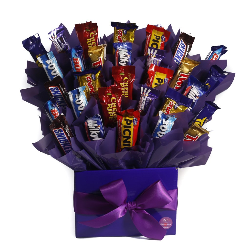 If you’re after something big and impressive, this is the one. This extra-large chocolate bouquet is filled with a generous selection of popular favourites, featuring a mix of Cadbury, Mars and Nestlé fun size chocolates that everyone will love. Standing at approximately 40cm tall, it also comes with a complimentary message card to complete your gift.